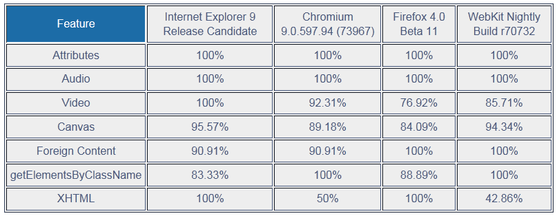 Browser compatibility with HTML 5 in September 2011 according to W3C
