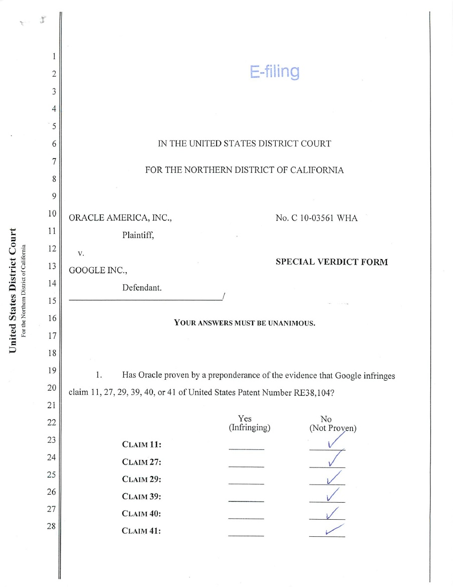 On May 23, 2012, a jury in the Northern California District Court in San Francisco unanimously decided that Google did not infringe on the two patents cited by Oracle. American lawyer Denise Howell estimates Oracle's legal costs at tens of millions of dollars .