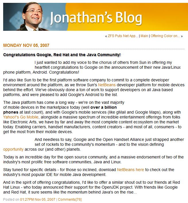 By adopting Java for its Android platform, Google gave Sun a huge service that Oracle, which acquired Java, benefited from. The then Sun CEO wrote enthusiastic articles about Google's initiative and its contribution to the Java expansion.