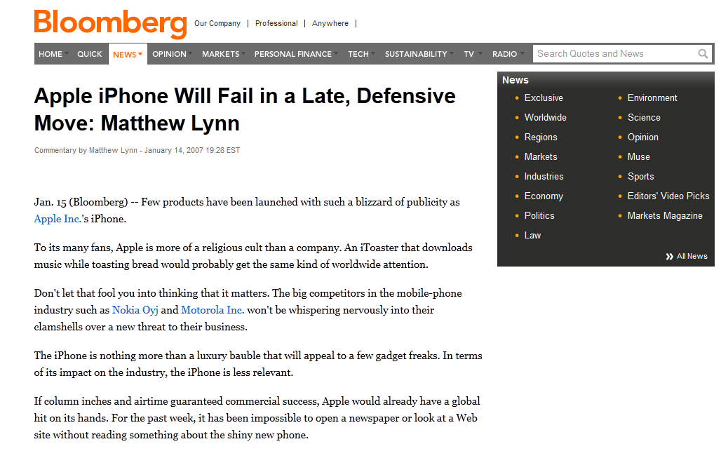 Perhaps he trusted this article in Bloomberg, which in 2007 confidently announced that the iPhone is a luxury product intended only for a few gadget lovers!